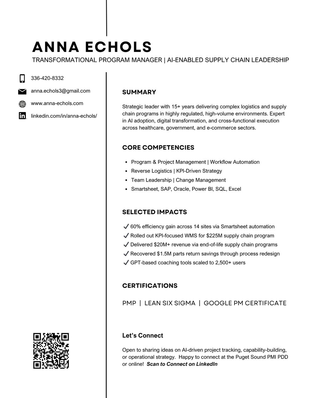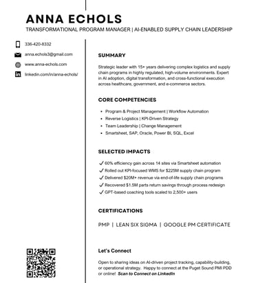 I’m Anna Echols, a Program Manager focused on AI-powered supply chain transformation, digital ops strategy, and team capability building. Here’s my one-pager with a quick snapshot of my work and how to reach me directly.
